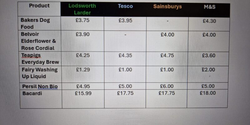 Our prices are not always higher than those of the major supermarkets. Today, we have done another price comparison on some of our products against some of the major retailers. So yes, some items come out slightly more here at the Larder, but some things are…